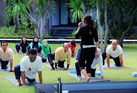 Pantai Kuta, Bali hampir selalu sukses menarik wisatawan mancanegara untuk berkunjung kesana. Kalau kita jalan-jalan di pantainya, bagi saya yang penduduk asli Bali, terkadang terlintas di pikiran bahwa kita tidak berada di Bali, saking banyaknya hal-hal yang berbau " Internasional" Cukup banyak perbedaan kalau saya flashback 25 tahun yl saat saya masih duduk di bangku SMA. Namun satu yang masih serupa, eksotismenya. Sunset, surfing, dan satu lagi...Yoga. Yoga bersama group meeting Pertamina di Pullman Bali cukup seru dan lucu juga. Nah yang lucunya, beberapa peserta yoga masih memakai seragam kantor/meeting alias baju kerja. Untuk persiapan dari pihak Pullman, saya rasa bagus, ada panggung, ada sound sistem, matras cukup banyak, dan yang terpenting staffnya ramah. hanya saja tamu/peserta yoga yang hadir masih belum ontime.